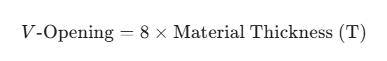 بالنسبة للفولاذ الطري القياسي، فإن القاعدة العامة لاختيار فتحة قالب V هي: